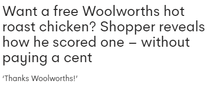 不久前,一名维州妈妈 Catherine Carney 在网上分享了这个小窍门,她自己刚拿到过免费烤鸡。