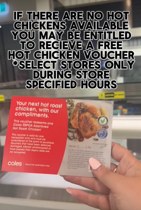 原来,Coles 有一项全国性政策:如果在特定时间内,没有可供购买的热烤鸡,你可以获得一张优惠券,在当周免费领取一只。