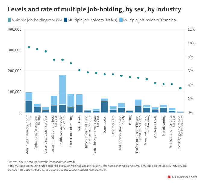 从事医疗保健、老年护理、残疾人服务、零售和酒店等服务行业职位的人数最多,女性拥有第二份工作的可能性远远高于男性。