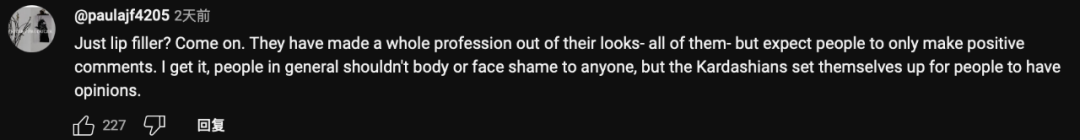 “只是唇部填充物这个问题吗?拜托。她们用自己的外表造就了一个完整的职业——她们所有人——但希望人们只做出积极的评价。我明白,一般人不应该对任何人的身体或脸感到羞耻,但卡戴珊一家却让人们有了意见。”