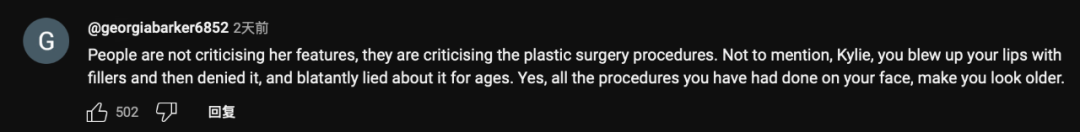 “人们不是在批评她的容貌,而是在批评整形手术。更不用说,凯莉,你用填充物填充了你的嘴唇,然后又否认了,还公然撒谎了好久。是的,你脸上做的所有手术都让你看起来更老了。”