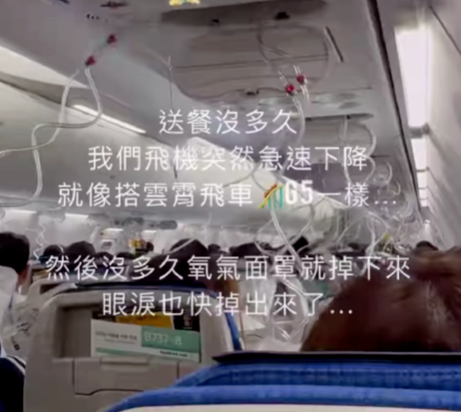 社交媒体上一名自称是机上乘客的网友IG@nancy10in发视频表示:“从3万多英尺下降到9,000多英尺,你能想像这一切有多可怕吗?”