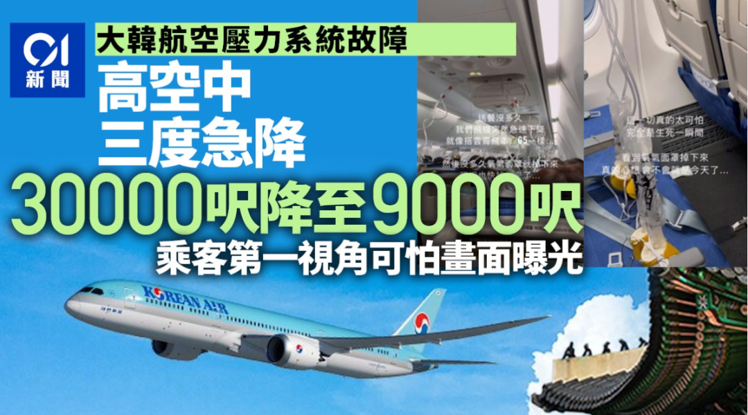 6月22日,大韩航空一架原定从首尔飞往中国台湾的飞机,因增压系统出现问题,飞机在空中从3万英尺(约9144米)的高度急坠到9000英尺(约2743米),氧气面罩弹出,多名乘客直接流鼻血,机舱内尖叫声和哭喊声一片,更有13人降落后被送往医院。
