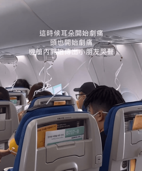 当时空姐们刚刚完成送餐,飞机下降速度过快导致氧气面罩弹出,包括小朋友在内、很多人被瞬间吓哭。