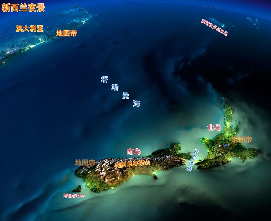 新西兰是位于南半球的一个高度发达的资本主义国家,其国土主要由南北两个大岛组成,中间隔着以英国航海家库克命名的“库克海峡”。