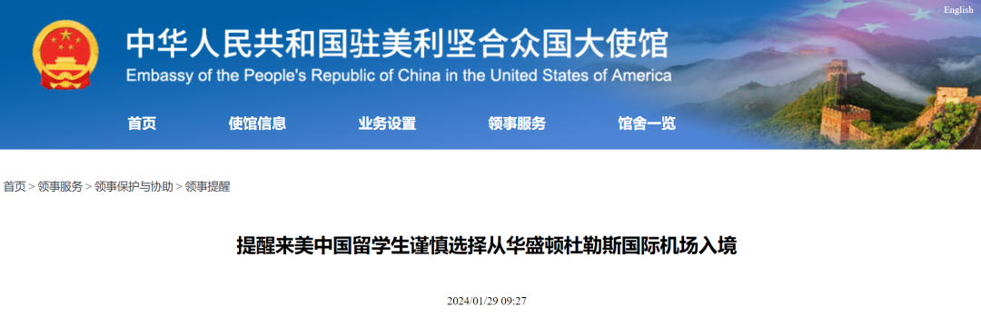 今年1月29日,中国驻美国大使馆发出通知,提醒赴美的中国留学生们,谨慎选择从华盛顿杜勒斯国际机场入境。