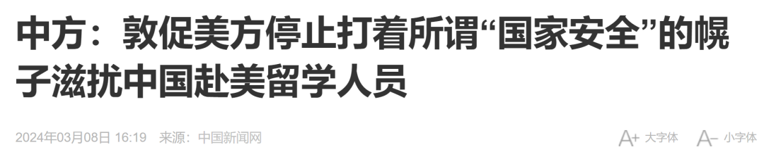 今年3月,中国外交部就事件向美方提出交涉,敦促美方停止打着国家安全的幌子,滋扰赴美留学人员。