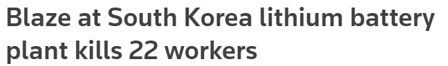 6月24日,当地时间上午10时31分左右,韩国京畿道华城市一产业园区的锂电池工厂发生火灾。据初步统计,