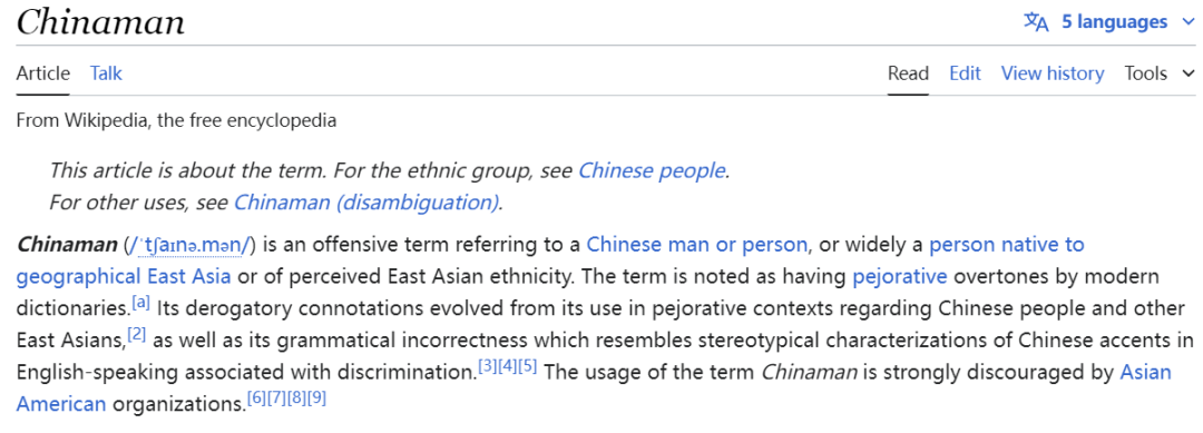 在Wikipedia中,也明确定义了Chinaman是一个歧视性词语