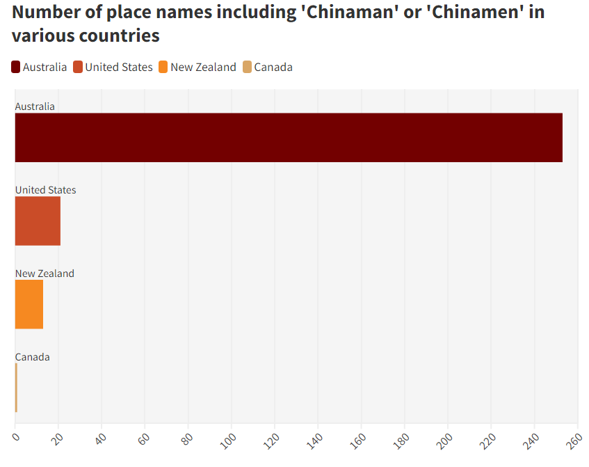 澳大利亚综合地名录显示,全澳共有253个地名包含“Chinaman”或“Chinamen”。