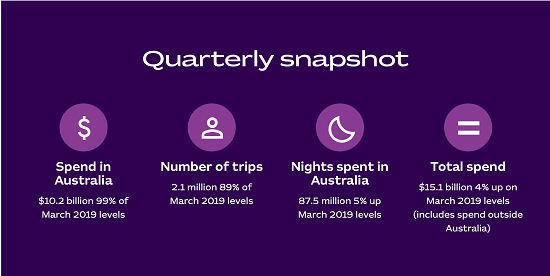 国际游客在澳支出达到疫情前水平的99%,为澳洲经济注入102亿澳元;出行次数达到疫情前水平的89%,且高于上一季度的81%。