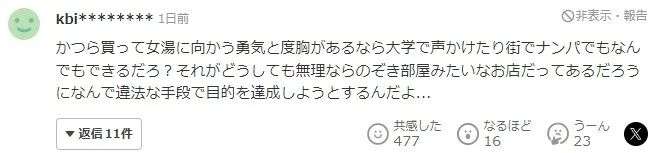“都有勇气买假发潜入女澡堂,可以在大学里或路边跟女生交流吧?如果实在做不到的话,还有风俗店什么的,为什么要通过违法的手段来达成目的呢……”