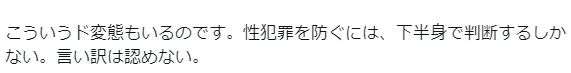 “原来有这样的变态。为了预防性犯罪,只能根据下半身做出判断。我不接受这些借口。”