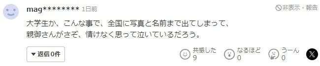 “大学生做出这种事情,被曝光名字和长相。父母一定很难过都哭了吧。”