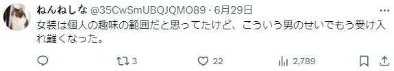 “我觉得女装属于个人兴趣的范畴,但就是有这种男性存在,让人难以接受。”