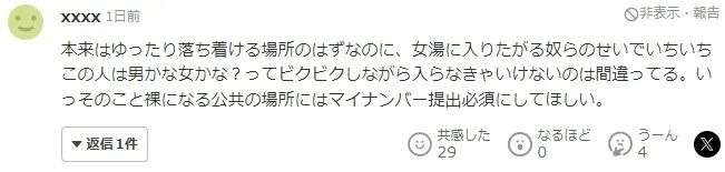 “女澡堂本应是一个可以让人放松和平静下来的地方,但因为这些家伙的存在,所以每次都要紧张,怀疑这个人是男是女。