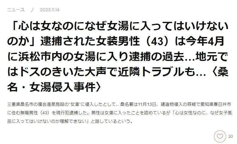 然而仅仅7个月后,2023年11月13日晚8点,男子B再次穿上女装,潜入三重县桑名市温泉的女浴池,结果被女顾客举报。