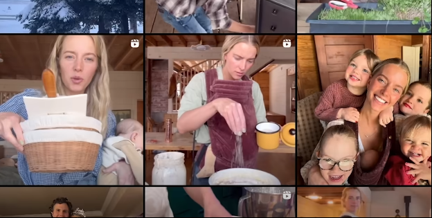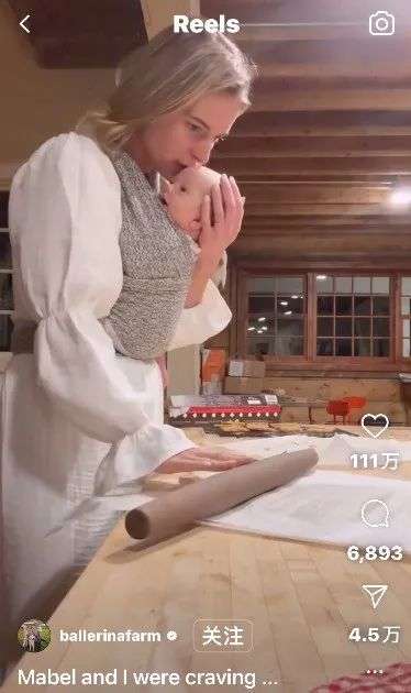 视频里她梳着田园风情的麻花辫,戴着绿色的围裙,胸前依然兜着孩子,两只手在镜头前娴熟地搅拌面粉、揉面团,将它们切块、切出精致的花纹,放入烤箱炙烤,最后在香脆焦黄的面包片上涂抹黄油。饭饭!香香!