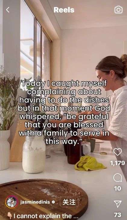 在杰斯敏的热门视频里,她先来了一段器宇轩昂的“娇妻宣言”:我不想要一份工作,我不想攀登阶梯,我不想当老板。我想在厨房做饭,我想打扫卫生,我想为家人购物。