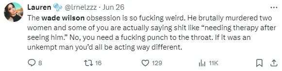 对Wade Wilson的痴迷真TM的奇怪。他残忍地杀害了两名女性,而你们中一些人居然说出像“看到他后被他吸引了”这样的话。不,你们需要被狠狠地揍一拳。如果是一个衣衫不整的男人,你们都会有完全不同的反应。