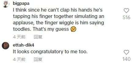 “我猜他不能鼓掌,所以他用手指敲击在一起模拟鼓掌,手指的摆动是他在说再见。这是我的猜测 🤔”