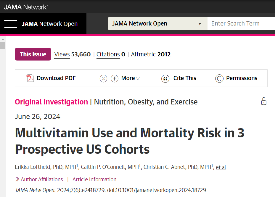近日,《美国医学会杂志》子刊《JAMA Network Open》上的一项新研究指出,对于健康成年人来说,每天服用复合维生素反而可能增加死亡风险,并且长期服用与降低死亡风险无关联。
