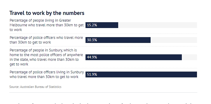 《时代报》的分析表明,越来越多的必要工作者被迫长途跋涉去上班。分析显示,警察最多的10个郊区——总共有1267名警察——平均距离市中心49公里。