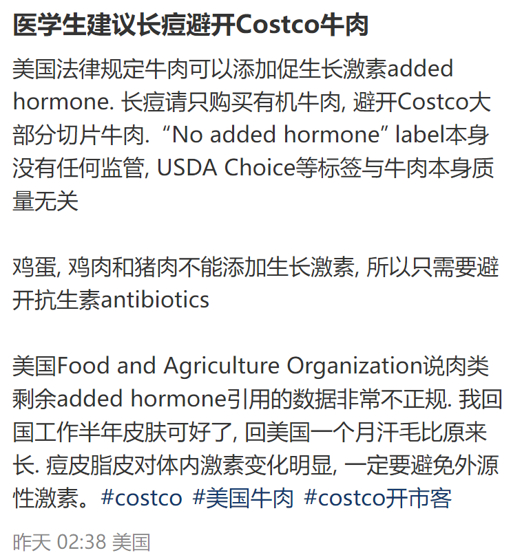 最近,社交平台上一篇来自美国网友的帖子称,Costco的大部分切片牛肉中含有一种促生长素hormone,医学生建议长痘的朋友少吃含有这种激素的牛肉。