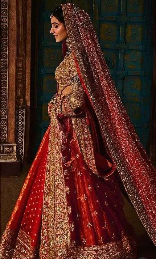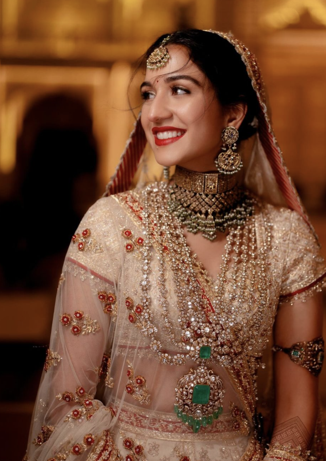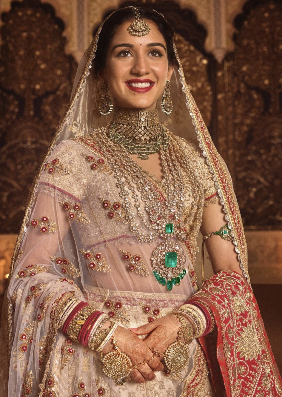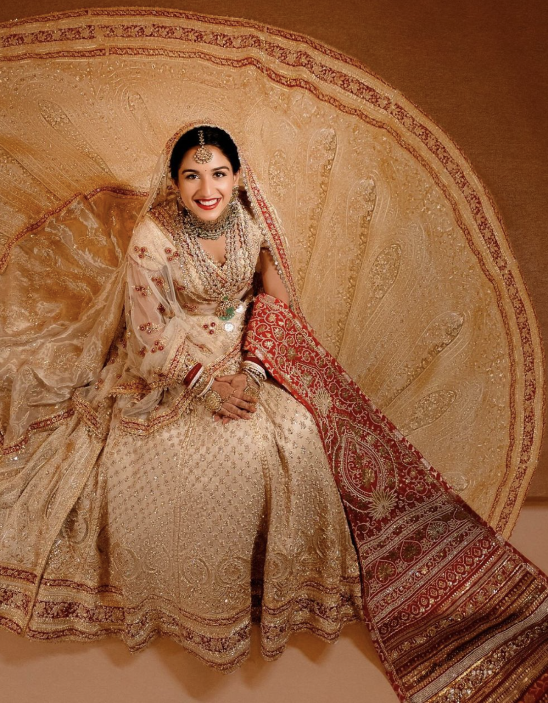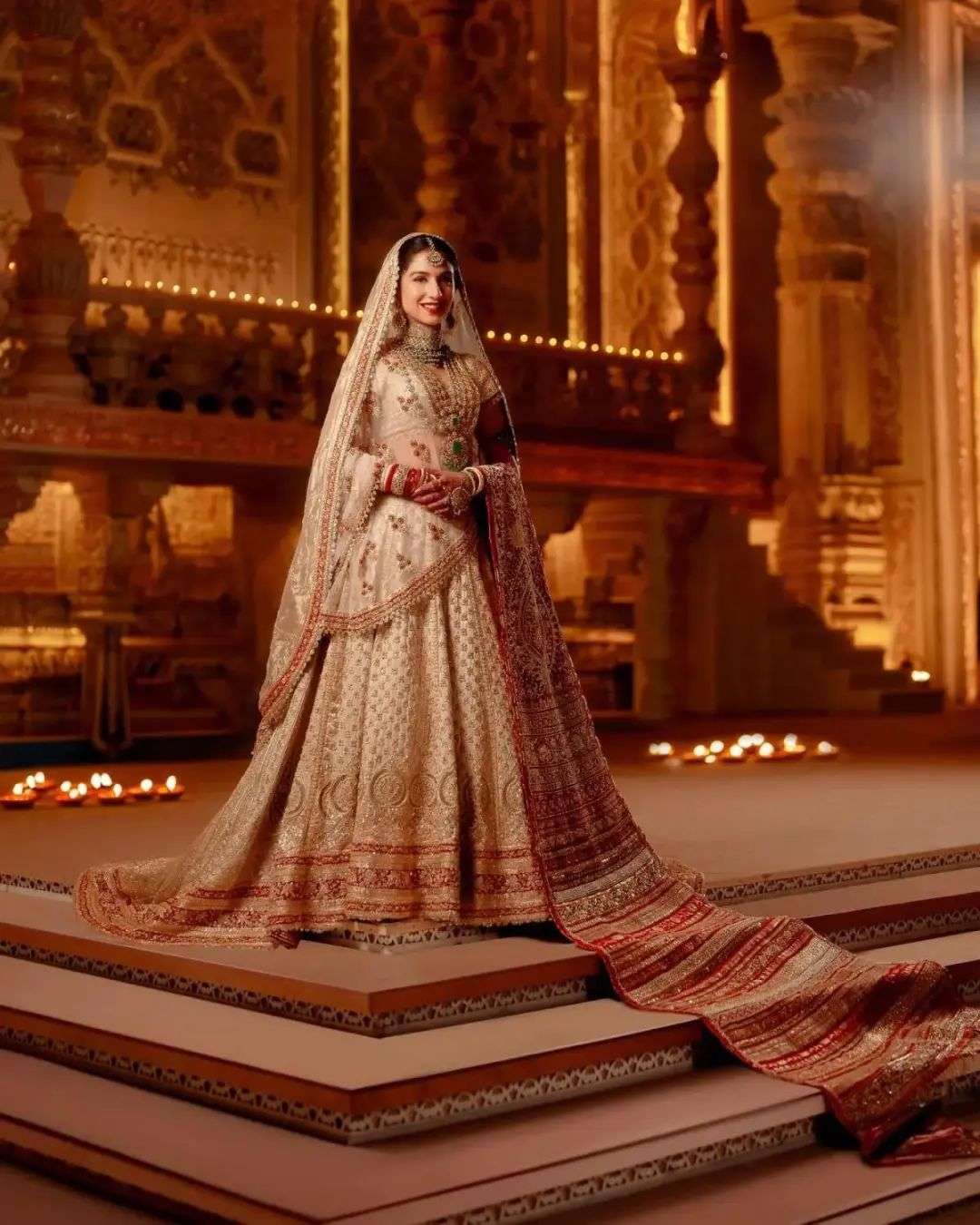 新娘拉蒂卡的婚服,是由两位印度著名设计师设计的印度传统红白婚礼服,象牙色礼服包括一条拖地裙,外层还加了一层可拆卸的拖尾,配有一条五米长的头纱和一条肩上搭的红色薄纱披肩。