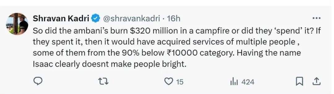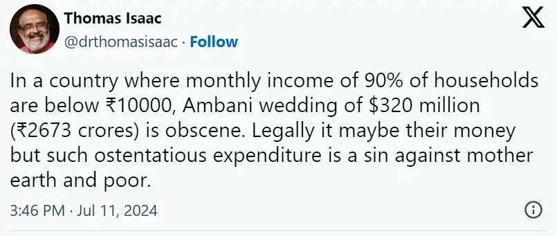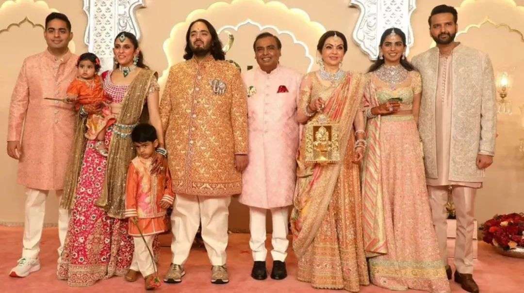 “在一个90%的家庭月收入低于一万卢比的国家里,安巴尼百亿卢比的婚礼是非常奢靡的。