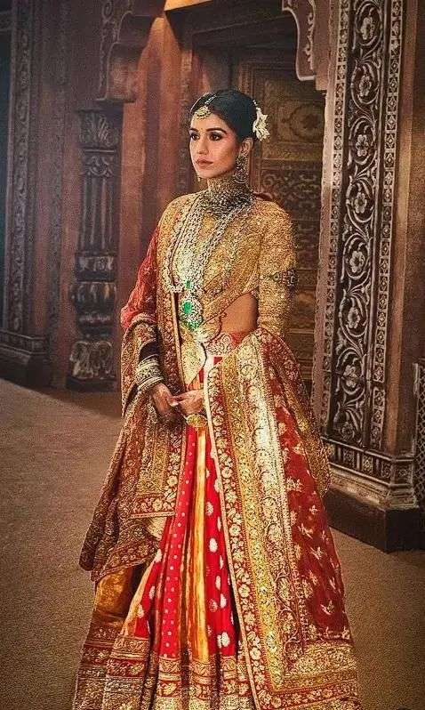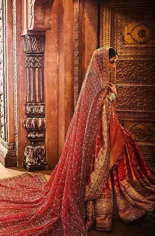 在这个和家人告别的环节,新娘拉蒂卡穿着一套金红色的礼服,这属于印度十九世纪的传统礼服。
