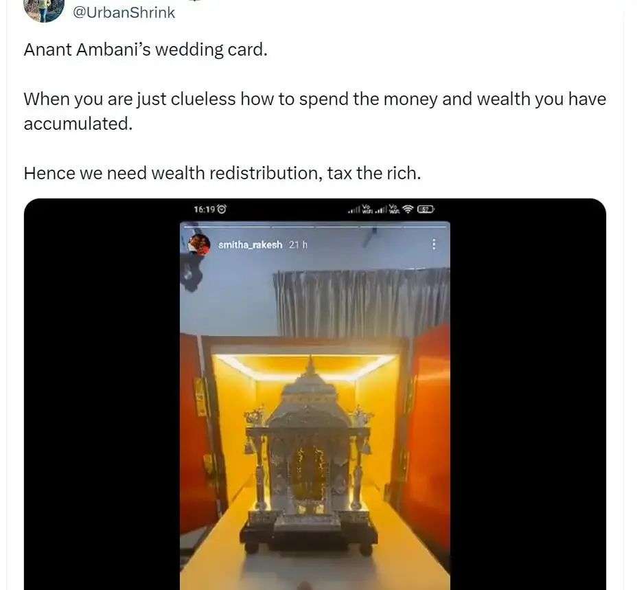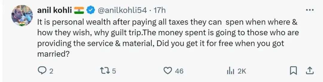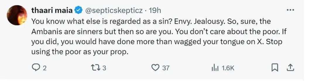 然而,随着安巴尼婚礼活动的照片铺天盖地地席卷网络,对特权强烈而普遍的不满声音开始越来越多……