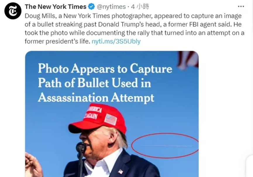 不过,纽约时报摄影师道格米尔斯(Doug Mills)拍摄的照片似乎捕捉到一颗子弹从前总统特朗普的头旁边飞过。