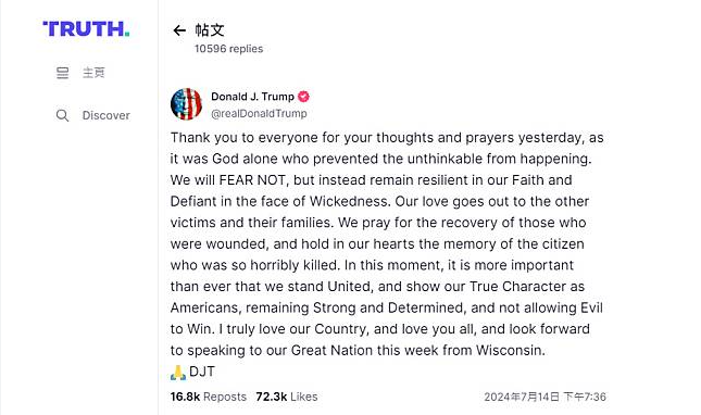 特朗普14日在社交媒体发文,回应前一天的枪击事件。