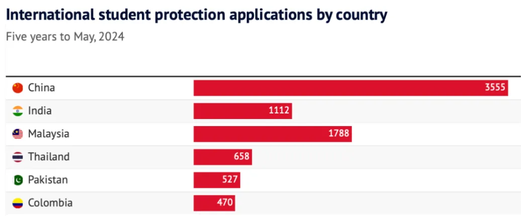 根据澳洲内政部提供的数据,在截至今年6月的五年里,有3555名中国留学生申请了庇护,而马来西亚留学生只有1788人,印度留学生1112人。