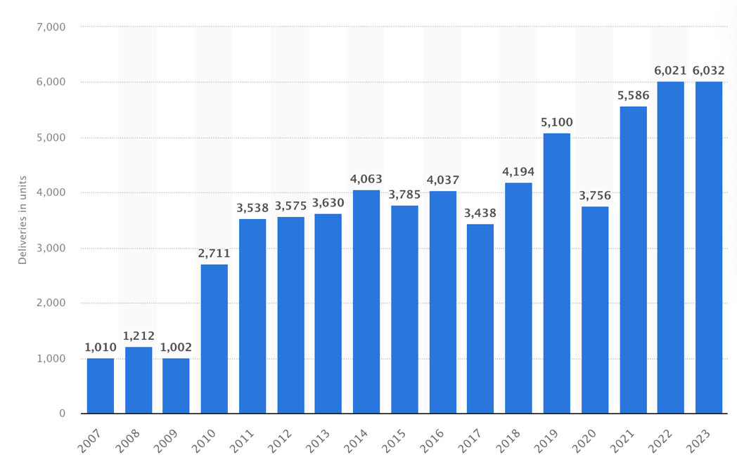 (劳斯莱斯往年销量。来源:statista)