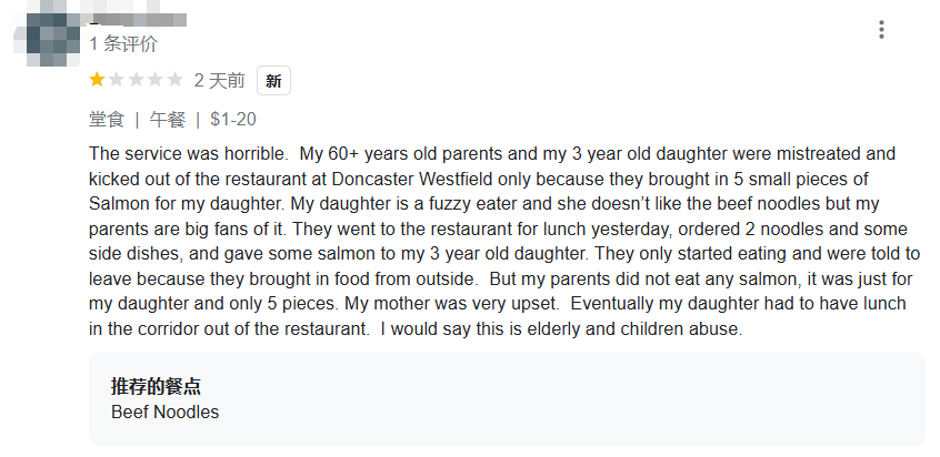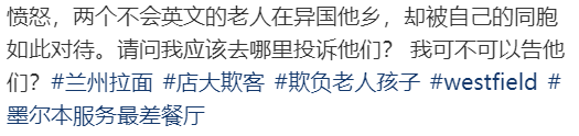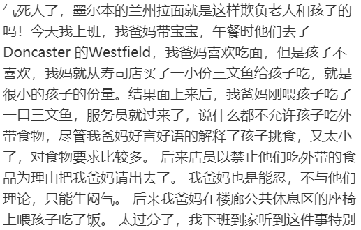 据这位博主描述,事情发生在墨尔本Doncaster的Westfield兰州拉面馆,“兰州拉面店大欺客,把我60岁的父母和3岁的女儿赶出去了。气死人了,墨尔本的兰州拉面就是这样欺负老人和孩子的吗!今天我上班,我爸妈带宝宝,午餐时他们去了Doncaster的Westfield,我爸妈喜欢吃面,但是孩子不喜欢,我妈就从寿司店买了一小份三文鱼给孩子吃,就是很小的孩子的份量。