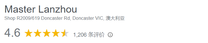 Doncaster的Westfield兰州拉面馆在Google名为“Master Lanzhou”,一共有1206条评价,评分为4.6。
