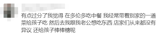 “有点过分了我觉得,我以前在多伦多吃中餐,经常带着别家的一道菜给孩子吃,然后我跟我老公点想吃东西,店家们从来都没有异议,还给孩子棒棒糖呢...”