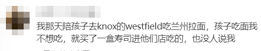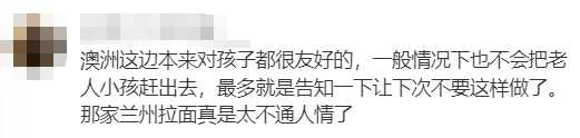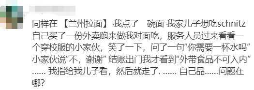 还有网友拿出自己的亲身经历,认为同样的情况,是店员的处理方式有问题,“同样在 【兰州拉面】 我点了一碗面,我家儿子想吃schnitz,自己买了一份外卖跑来做我对面吃,服务人员过来看看一个穿校服的小家伙,笑了一下,问了一句‘你需要一杯水吗’,小家伙说‘不,谢谢’, 结账出门我才看到‘外带食品不可入内’ … 我指给我儿子看,然后就走了,自己品,问题在哪?”“规矩是死的,人是活的,应该通融一下,我知道我的想法是错的,我也不会这么做,只是比较同情老人来异乡的不容易...”“澳洲这边本来对孩子都很友好的,一般情况下也不会把老人小孩赶出去,最多就是告知一下让下次不要这样做了。那家兰州拉面真是太不通人情了...我那天陪孩子去knox的westfield吃兰州拉面,孩子吃面我不想吃,就买了一盒寿司进他们店吃的,也没人说我。”“一般的店家,即使不可以外带食品,三岁孩子的食物总归可以商量的。这么严苛对待老人孩子是太过分了。”“确实气人,何必为难老人和孩子。只是一个小孩子啊。 但凡有点共情能力也不至于这样。 规矩是商业规矩为了盈利,既然不是是非黑白的问题,就应该把人性放在前面。”“在墨尔本生活这么久,第一次看到不给小朋友吃外食的。