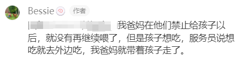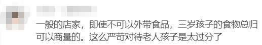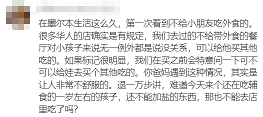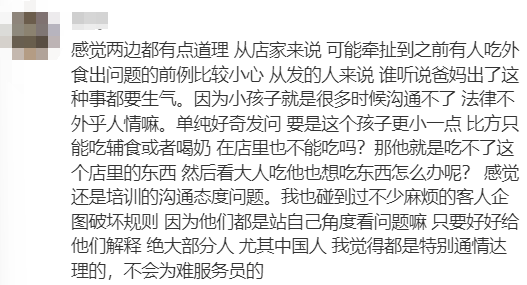 “感觉两边都有点道理,从店家来说,可能牵扯到之前有人吃外食出问题的前例比较小心,从发的人来说,谁听说爸妈出了这种事都要生气。因为小孩子就是很多时候沟通不了,法律不外乎人情嘛。单纯好奇发问,要是这个孩子更小一点,比方只能吃辅食或者喝奶,在店里也不能吃吗?那他就是吃不了这个店里的东西,然后看大人吃他也想吃东西怎么办呢?感觉还是培训的沟通态度问题。我也碰到过不少麻烦的客人企图破坏规则,因为他们都是站自己角度看问题嘛,只要好好给他们解释,绝大部分人,尤其中国人, 我觉得都是特别通情达理的,不会为难服务员的。”