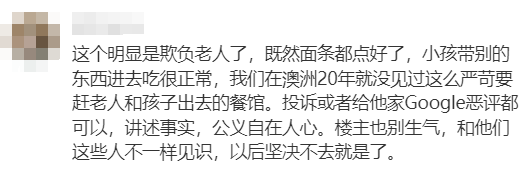 “这个明显是欺负老人了,既然面条都点好了,小孩带别的东西进去吃很正常,我们在澳洲20年就没见过这么严苛要赶老人和孩子出去的餐馆。投诉或者给他家Google恶评都可以,讲述事实,公义自在人心。楼主也别生气,和他们这些人不一样见识,以后坚决不去就是了。“我也是商家,也有经常客人拿着外面的食物,我都允许,因为人家进来有消费,一般商家估计都会允许。”