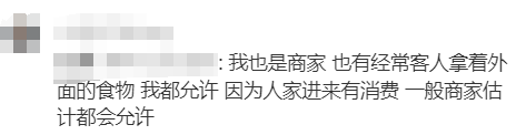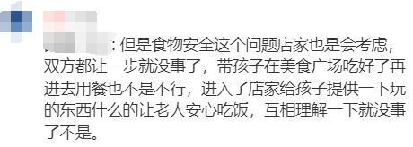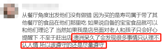 有开过餐饮店的网友说,“还是小心一点,我家也是做餐饮的,几年前吧,有个人买了一个两刀的点心伴着别的吃,过了两天来非要说是点心坏了,要我们赔...澳洲有点麻烦,要是有什么事是先默认你确实有错的,直到你自证清白。那吃的东西就很难讲清楚了,所以大部分的地方都不会让外带食物,免的出了事麻烦...”不过,也有一部分网友保持中立,认为店家有制定店内用餐规则的权利,食客也有选择的权利,这种矛盾原本可以避免,“食物安全这个问题店家也是会考虑,双方都让一步就没事了,带孩子在美食广场吃好了再进去用餐也不是不行,进入了店家给孩子提供一下玩的东西什么的,让老人安心吃饭,互相理解一下就没事了不是。”