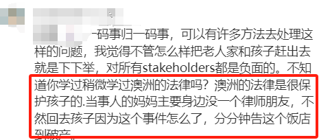 不知道你学过稍微学过澳洲的法律吗?澳洲的法律是很保护孩子的,当事人的妈妈主要身边没一个律师朋友,不然回去孩子因为这个事件怎么了,分分钟告这个饭店到破产。”