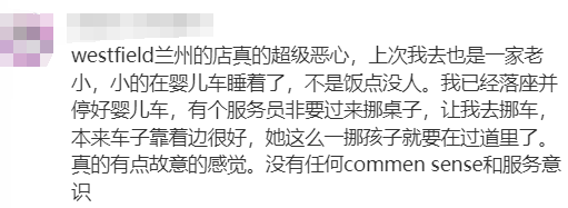 “Westfield兰州的店真的超级恶心,上次我去也是一家老小,小的在婴儿车睡着了,不是饭点没人。