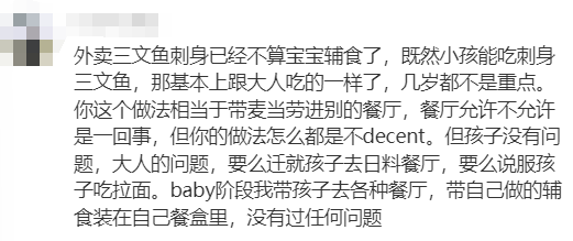 你这个做法相当于带麦当劳进别的餐厅,餐厅允许不允许是一回事,但你的做法怎么都是不decent。但孩子没有问题,大人的问题,要么迁就孩子去日料餐厅,要么说服孩子吃拉面。baby阶段我带孩子去各种餐厅,带自己做的辅食装在自己餐盒里,没有过任何问题。”