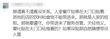 “人家餐厅如果在大门口贴着:其他的店的饮料和食物不能带进来。那就是人家的规矩。那就要遵守。你带进来了服务员管,天经地义,要比贴在大门口给鬼看的?如果没贴那自然随便带没人管。“