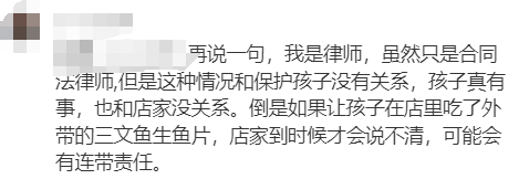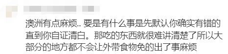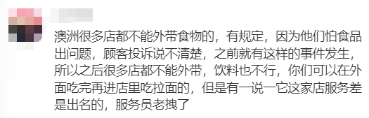 其次,在澳洲,万一因为在店内吃东西出现健康问题,无论是不是店里的饮食,店家都需要为此负责,“澳洲很多店都不能外带食物的,有规定,因为他们怕食品出问题,顾客投诉说不清楚,之前就有这样的事件发生,所以之后很多店都不能外带,饮料也不行,你们可以在外面吃完再进店里吃拉面的,但是有一说一它这家店服务差是出名的,服务员老拽了。”“我是律师,虽然只是合同法律师,但是这种情况和保护孩子没有关系,孩子真有事,也和店家没关系。倒是如果让孩子在店里吃了外带的三文鱼生鱼片,店家到时候才会说不清,可能会有连带责任。”