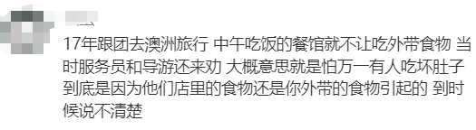 “17年跟团去澳洲旅行,中午吃饭的餐馆就不让吃外带食物,当时服务员和导游还来劝,大概意思就是怕万一有人吃坏肚子,到底是因为他们店里的食物还是你外带的食物引起的,到时候说不清楚...”