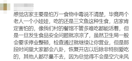 “感觉店家主要是怕万一食物中毒说不清楚,毕竟两个老人一个小娃娃,吃的还是三文鱼这种生食,店家肯定害怕的,